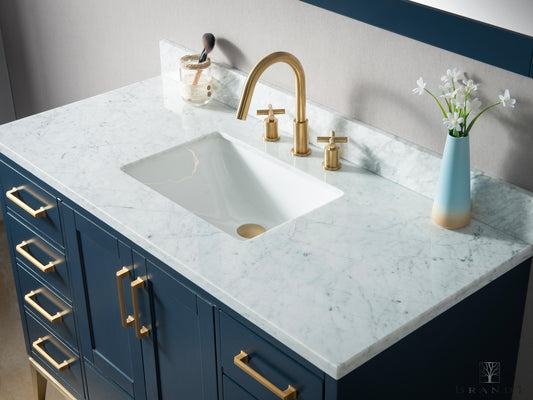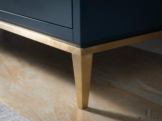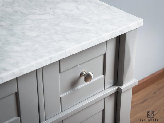 Alle møbler er bygget i heltre, har skuffer med svalehaleskjøter, messingdetaljer og benkeplater i marmor eller quartz kompositt.