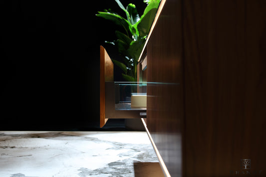 I Aparte kolleksjonen introduserer vi nye materialer til markedet. Materialer som valnøtt, stein og skinn, og benkeplater i innovative materialer eller eksklusive marmortyper.