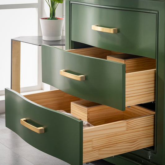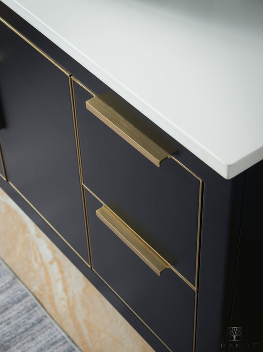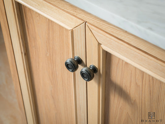 Alle møbler er bygget i heltre, har skuffer med svalehaleskjøter, messingdetaljer og benkeplater i marmor eller quartz kompositt.